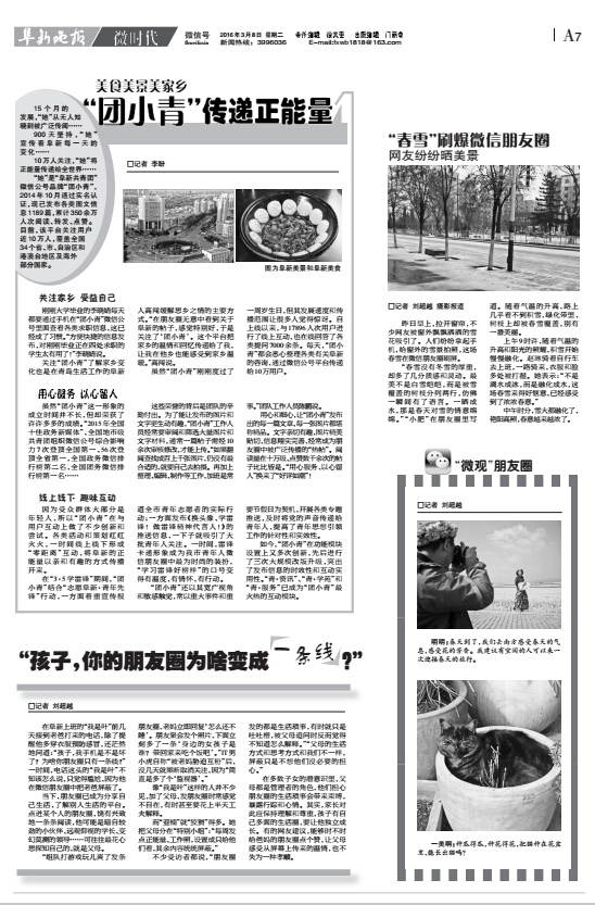 美食美景美家乡“团小青”传递正能量 15个月发展,“她”从无人知晓到被广泛传阅……900天坚持,“她”宣传着阜新每一天的变化……10万人关注,“她”将正能量传递给全世界……她是我市“阜新共青团”微信公号品牌“团小青”,2014年10月通过实名认证,现已发布各类图文信息1189篇,累计350余万人次阅读、转发、点赞。目前,该平台关注用户近10万人,覆盖全国34个省、市、自治区和港澳台地区及海外部分国家。关注家乡 受益自己刚刚大学毕业的李晓婧每天都要通过手机在“团小青”微信公号里面查看各类求职信息,这已经成了习惯。“方便快捷的信息发布,对刚刚毕业正在四处求职的学生太有用了!”李晓婧说。关注“团小青”了解家乡变化成了在青岛生活工作的阜新人高闯缓解思乡之情的主要方式。“在朋友圈无意中看到关于阜新的帖子,感觉特别好,于是关注了“团小青”。她把家乡的温情和回忆传递给了我,让我在他乡也能感受到家乡温暖。”高闯说。虽然“团小青”刚刚度过了一周岁生日,但其发展速度和传播范围让很多人觉得惊讶。自上线以来,共有17896人次的用户和她进行了线上互动,“团小青”也在线回答了各类提问7000余条。每天,“团小青”都会悉心整理各类有关阜新的咨询,通过微信公号平台传递给10万用户。用心服务 以心留人虽然“团小青”这一形象的成立时间并不长,但却荣获了许许多多的成绩。“2015年全国十佳政务新媒体”、全国地市级共青团组织微信公号综合影响力7次登顶全国第一、56次登顶全省第一,全国政务微信排行榜全国第二名,全国团务微信排行榜全国第一名……这些荣誉的背后是团队的辛勤付出。为了能让发布的图片和文字更生动有趣,“团小青”工作人员经常要审阅和筛选大量图片和文字材料,通常一篇帖子需经10余次审核修改,才能上传。“如果翻阅查找成百上千张图片,仍没有最合适的,就要自己去拍摄。再加上整理、编辑、制作等工作,加班是常事。”团队工作人员陈鹏说。用心和细心,让“团小青”发布出每一篇文章、每一张图片都堪称精品。文字亲切有趣,图片精美贴切,信息翔实完善,经常成为朋友圈中被广泛传播的“热帖”。阅读量在十万级、点赞数千余次的帖子比比皆是。“用心服务、以心留人”换来了“好评如潮”!线上线下趣味互动因为受众群体大部分是年轻人,所以“团小青”在与用户互动上做了不少创新和尝试。各类活动和策划红红火火,一时间线上线下形成“零距离”互动,将阜新特有的正能量以亲和有趣的方式传播开来。在“3·5学雷锋”期间,“团小青”结合“志愿阜新·青年先锋”行动,一方面着重宣传报道全市青年志愿者的实际行动;一方面发布《换头像、学雷锋!做雷锋精神代言人!》的推送信息,一下子就吸引了大批青年人关注。一时间,雷锋卡通形象成为我市青年人微信朋友圈中最为时尚的装扮,“学习雷锋好榜样”的口号变得有温度、有情怀、有趣味。“团小青”还以其宽广视角和敏感触觉,常以重大事件和重要节假日为契机,开展各类专题推送。如在“两会”期间,“团小青”连续推送了《张铁民书记两会发言引发中央媒体关注》、《团小青话两会,一图读懂政府工作报告里的十大青年红利》等专题信息,及时将党的声音传递给青年人,提高了青年思想引领工作的针对性和实效性。如今,“团小青”在功能模块设置上又多次创新,先后进行了三次大规模改版升级,突出了发布信息的时效性和互动实用性。“青·资讯”、“青·学苑”和“青·服务”已成为“团小青”最火热的互动模块。 将阜新美景“穿”在身上